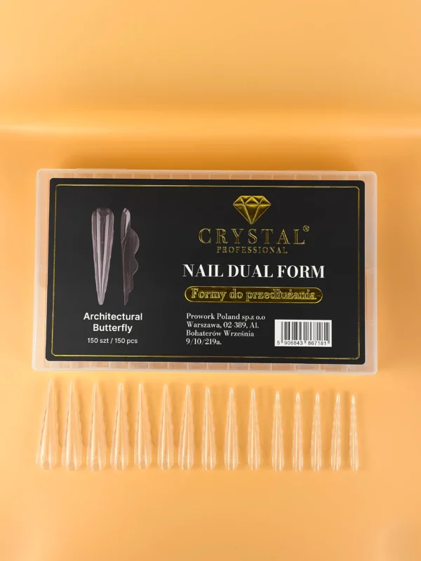 Ilość w opakowaniu: 150 szt. Profesjonalne formy górne (Dual Form) marki Crystal Professional przeznaczone do szybkiego i precyzyjnego przedłużania paznokci metodą żelową, akrylożelową oraz polygel. Kształt Architectural Butterfly pozwala uzyskać efektowną, smukłą stylizację z wyraźnie zarysowaną architekturą paznokcia oraz eleganckim zwężeniem ku końcówce.