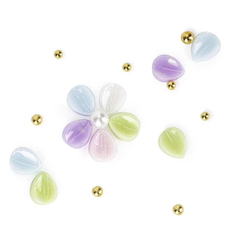 - Zestaw zawiera ok. 150 sztuk akrylowych kwiatków w mixie kolorów oraz złote kulki dekoracyjne.
