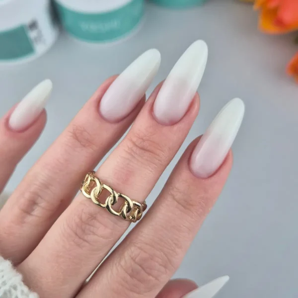 Klasyczny, mleczny odcień o wysokim stopniu krycia (4/5), który daje czysty, jednolity efekt już po jednej warstwie budującej. Kolor jest neutralny i elegancki, bez wyraźnych tonów różu czy beżu.